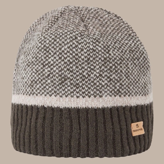 Stylish knitted beanie made from part-recycled polyester and wool-blend yarn with chunky ribbed headband and stitched-on brand badge.